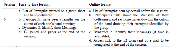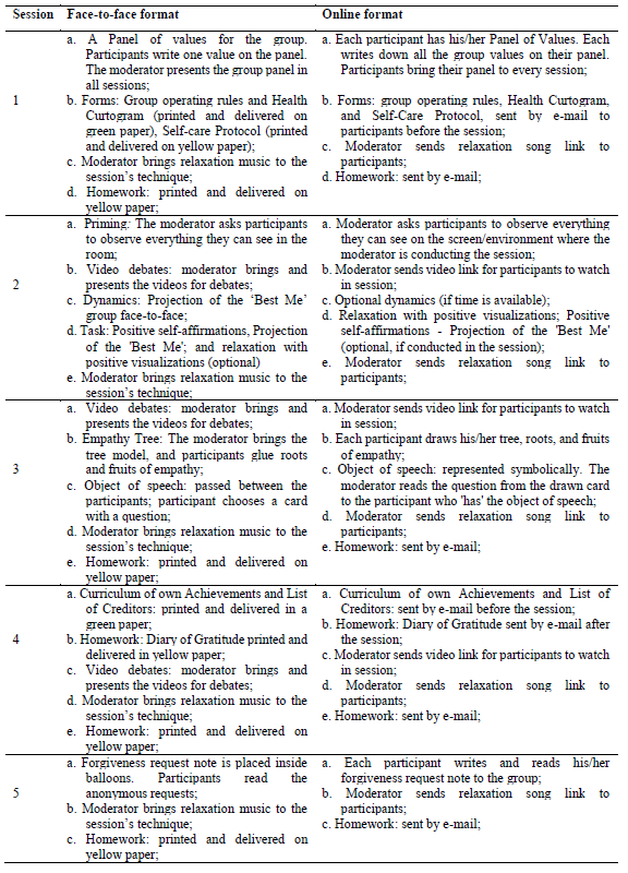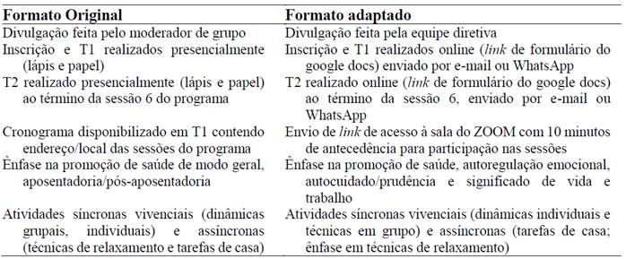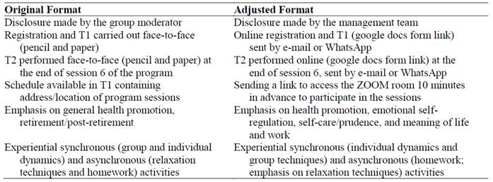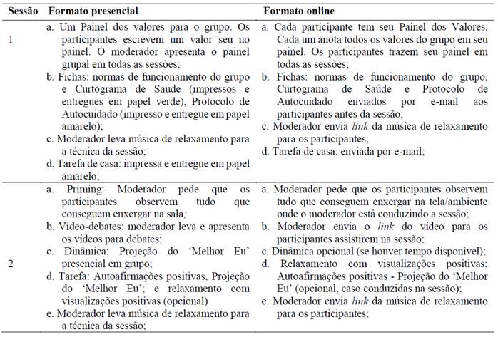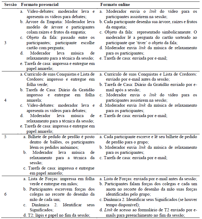 A partir da avaliação de processo, conforme registros do diário de campo do moderador, foram introduzidas mudanças na estrutura, em dinâmicas e materiais utilizados nas sessões, de modo a viabilizar a implementação online, conforme ilustrado na tabela 2.
