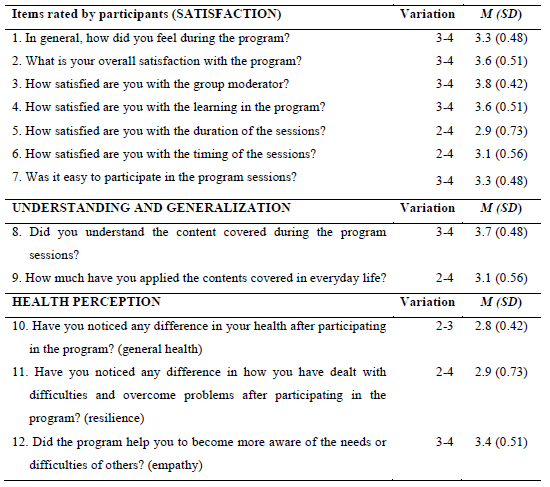 Table 3 shows variations in scores (between 1 and 4), means (M), and standard deviation (SD) of the objective questions of the participants’ evaluations regarding satisfaction with the program and the moderator, understanding, and generalization of the contents covered in the program and health issues, per the participants’ self-report.