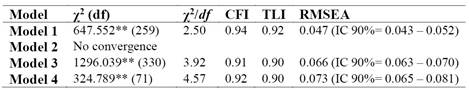 As it can be observed in Table 1, Model 1 is not only adequate but superior to all the other tested models, with fit indices following the expected criteria. However, Model 2 did not converge after the CFA was conducted.