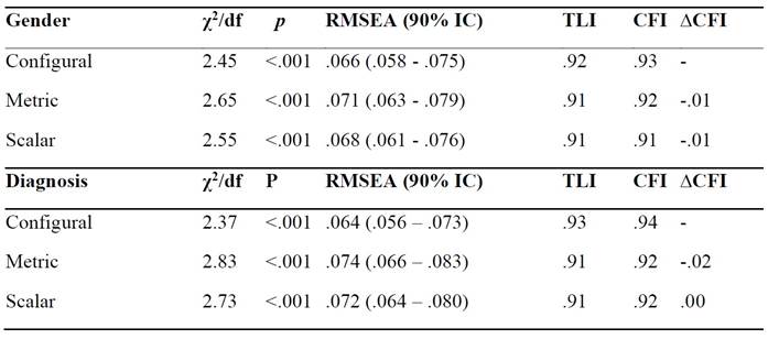 The second-order model presented metric and scalar invariance by gender. However, when testing the invariance by diagnosis, metric invariance was not observed although the fit-indices are still adequate.