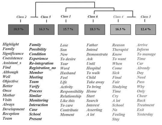 Class 5 comprises 18.3 % of the corpus, being one of the classes with the highest percentage, and the words family and possibility are the most prominent. The word possibility is closely related to the reflections made by the team, together with the families.