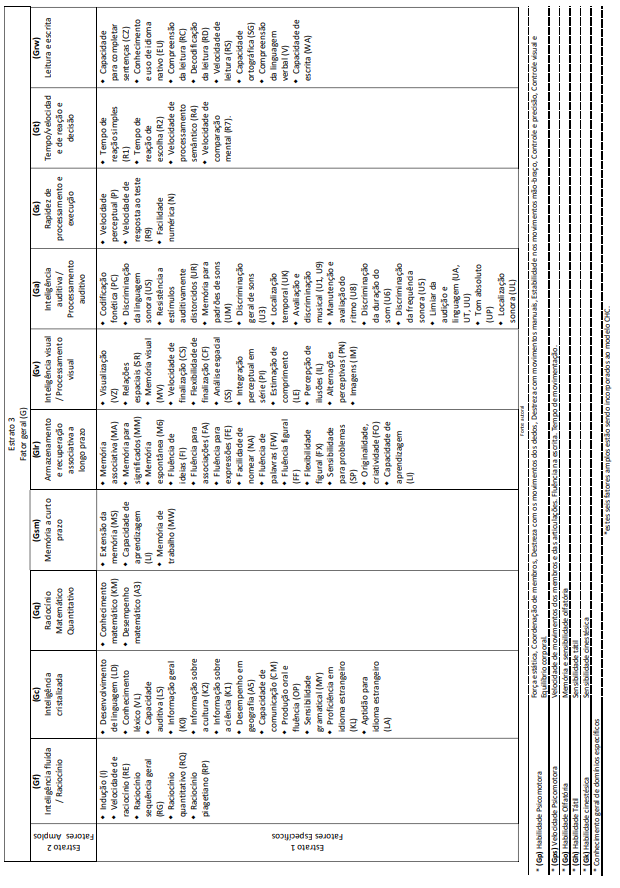 Nota: Inteligência fluida (Gf), Inteligência cristalizada (Gc), Raciocínio matemático quantitativo (Gq), Memória em curto prazo (Gsm), Armazenamento e recuperação da memória de longo prazo (Glr), Processamento visual (Gv), Processamento auditivo (Ga), Rapidez de processamento e execução (Gs), Velocidade de reação e decisão (Gt), Leitura e escrita (Grw).