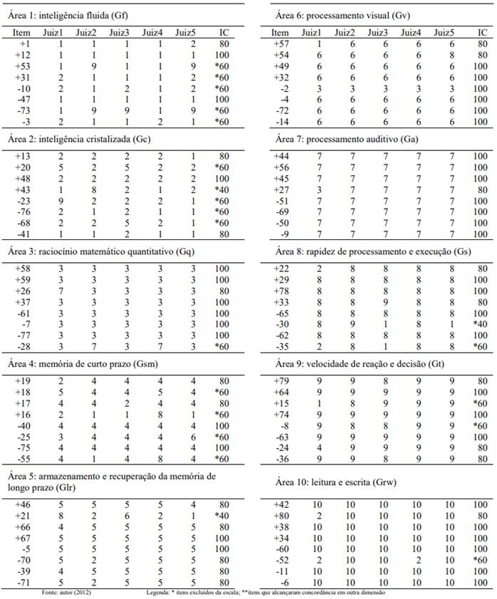 Considerando-se cada área, os itens que não se mostraram consensuais pertenciam aos domínios: inteligência fluída (n = 5), inteligência cristalizada (n = 5), raciocínio matemático quantitativo (n = 1), memória de curto prazo (n = 4), armazenamento e recuperação de memória em longo prazo (n = 1), rapidez de processamento e execução (n = 2), velocidade de reação e decisão (n = 2) e leitura/escrita (n = 1). As dimensões processamento visual e processamento auditivo apresentaram adequação de todos os seus itens. Os resultados são apresentados na Tabela 1.