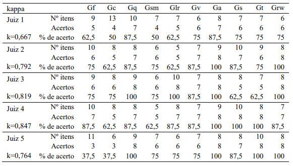 Em seguida, a estimativa do coeficiente Kappa foi conduzida, visando verificar a intensidade de concordância entre os avaliadores. Para isso o cruzamento entre as classificações feitas pelos juízes comparando-as com um “juiz ideal” (as dimensões originais dos itens) foi realizada. Estimou-se o número de itens classificados em cada um dos domínios, bem como o número e porcentagem de acerto nas classificações realizadas. Os resultados são apresentados na Tabela 2.