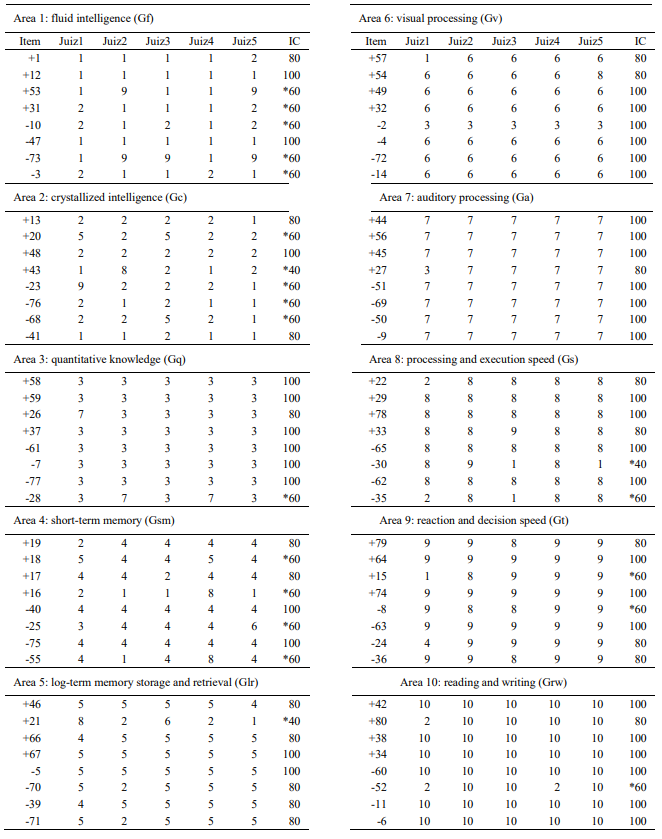 Two items showed agreement in other dimensions, different from the ones originally thought. This was the case for two items: item 41 of the crystallized intelligence domain, which was relocated to the fluid intelligence domain, item 2 of visual processing, which was classified as quantitative knowledge. Such items were reallocated to the dimension indicated by the reviewers.