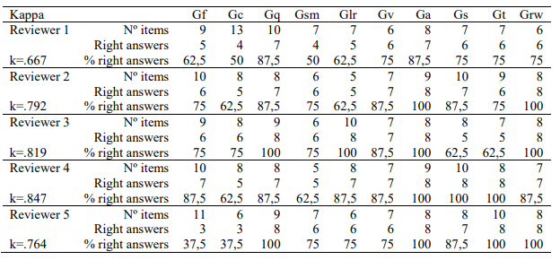 If analyzed separately, in each dimension there was a hit above 87.5 % in the judgment of the reviewers: quantitative knowledge (five reviewers) and auditory processing (five reviewers). On the other hand, the areas of fluid intelligence (only one reviewer) reaction and decision speed (two reviewers) grouped the items that had a lower percentage of correct answers by the reviewers, possibly indicating other doubts.