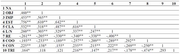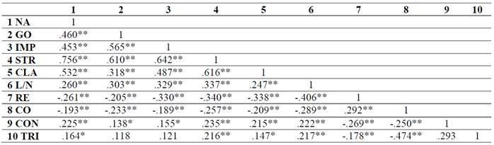 Notas: 1 NA: não aceitação; 2 OBJ: objetivos; 3 IMP: impulsos; 4 EST: estratégias; 5 CLA: clareza; 6 L/N: labilidade; 7 RE: regulação emocional; 8 COO: cooperação mãe; 9 CON: conflito mãe; 10 TRI: triangulação mãe.