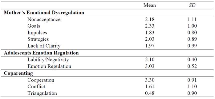 Foram realizadas estatísticas descritivas com as variáveis trabalhadas neste estudo, desregulação emocional das mães com as dimensões: não aceitação das emoções negativas (Não Aceitação), incapacidade de se envolver em comportamentos dirigidos por objetivos quando experiencia emoções negativas (Objetivos), problemas em controlar comportamento impulsivo quando experiencia emoções negativas (Impulsos), acesso limitado às estratégias de regulação emocional (Estratégias) e falta de clareza emocional (Clareza) (variável exógena), regulação emocional dos filhos adolescentes: dimensões labilidade/negatividade e regulação emocional (variável endógena) e coparentalidade: dimensões cooperação, conflito e triangulação (variável mediadora). A descrição das análises de média e desvio padrão se encontra na Tabela 1.