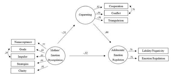 As for the model's standardized regression coefficients, the directions already indicated that the dimensions of the mothers' emotional dysregulation negatively affect the perceived emotional regulation of adolescent children, as well as negatively in the mediating variable coparenting (showing a negative relationship with cooperation, and a positive relationship with conflict and triangulation). It has been identified that the prediction of the dimensions of emotional dysregulation of mothers for coparenting (β = 0.31) and for emotional regulation of adolescents (β = -0.32) showed moderate indices.