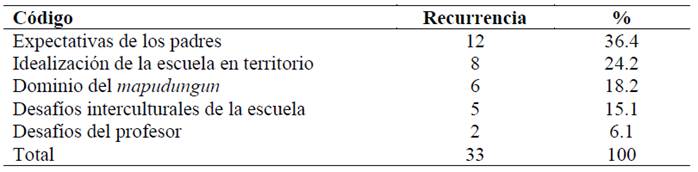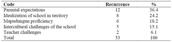 La subcategoría desafíos de la escuela en contexto indígena se relaciona con los aspectos a mejorar en los procesos de enseñanza y aprendizaje. Esta obtiene una frecuencia de 16.5 % de un total de 200 recurrencias y se compone de cinco códigos (Tabla 4).