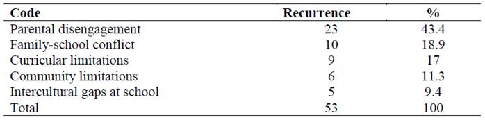 La subcategoría limitaciones de la escuela multinivel en contexto indígena refiere a los obstaculizadores que interfieren en el desarrollo de los procesos de enseñanza y aprendizaje. Esta subcategoría obtiene una frecuencia de 26.5 % de un total de 200 recurrencias y se compone de cinco códigos (Tabla 3).