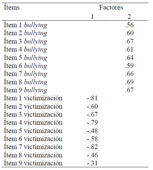 Tabla 1: Cargas factoriales para el análisis factorial exploratorio del cuestionario de Olweus en niños