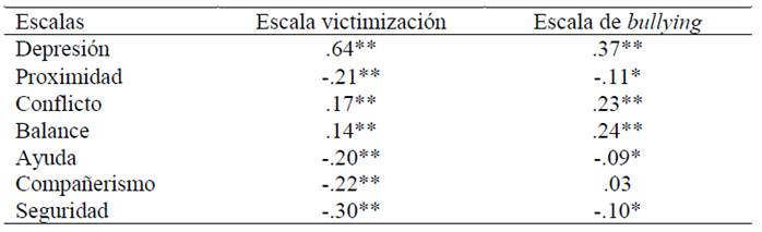 Para observar la validez concurrente de la escala victimización y bullying, se llevaron a cabo correlaciones de Spearman entre éstas y la escala de depresión de Kovacs y las escalas de amistad de Bukowski et al. (Tabla 3).