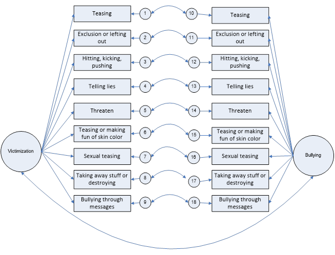 Figure 1: Model of the Revised Olweus Bully/Victim Questionnaire in Children to Be Tested
