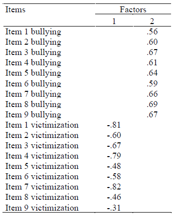 Regarding the exploratory factorial analysis, the results yielded a model of two related factors that could be called victimization and bullying, without cross-loading and loading all in their respective factor. These two dimensions are those postulated by the author of the test (Olweus, 1996, 2013) and the two factors measured by the test. These results also coincide with studies on adolescents in Argentina (Resett, 2011, 2018). The two aforementioned dimensions have been shown to be associated with internalizing and externalizing problems in numerous studies (Olweus, 2013; Resett, 2018).