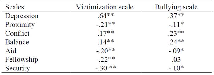 To observe the concurrent validity of the victimization and bullying scale, Spearman correlations were carried out between them and the Kovacs depression scale and the friendship scales of Bukowski et al. Table 3 shows the results of this analysis.