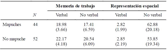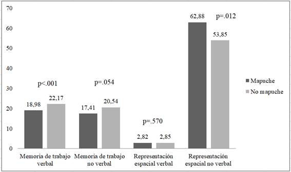 The objective of this study was to determine whether there are differences in the performance of working memory and spatial representation tasks in verbal and non-verbal modalities in Mapuche and non-Mapuche children from La Araucanía region. The results of this study suggest that there are differences in performance in verbal working memory tasks, as non-Mapuche children obtain better results. On the other hand, it was found that Mapuche children performed better in nonverbal spatial representation tasks.