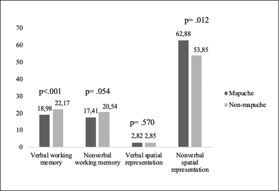 In accordance with the specific objectives, in the first place, it was established that performance in verbal memory tasks differed significantly between Mapuche and non-Mapuche children. It was observed that Mapuche schoolchildren scored lower than non-Mapuche schoolchildren in verbal working memory tasks (F(1,92) = 13.52, p < .001, η2 = .128).