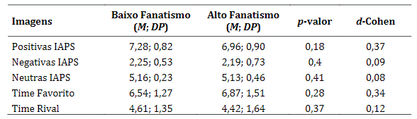 A ANOVA revelou um efeito significativo para a variável “Imagens” indicando que as categorias (time favorito; time rival; imagens positivas, neutras e negativas do IAPS) distinguiram entre si (F4,104=4,127; p < 0,001; η2=0,746) independentemente do nível de fanatismo. Comparações planejadas adicionais indicaram diferenças significativas para a dimensão entre todas as categorias de imagens, exceto entre as imagens neutras do IAPS e do time rival (p = 0,08; d = 0,34). Os valores obtidos em cada comparação estão especificados na Tabela 1.
