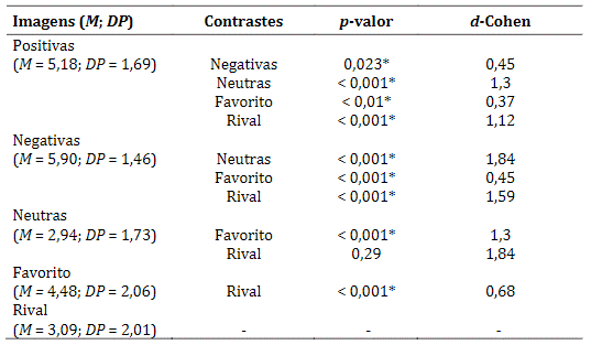 Na análise da ativação emocional, a ANOVA apresentou um efeito significativo para a variável “Imagens” ao revelar que as diferentes categorias (time favorito; time rival; imagens positivas, neutras e negativas do IAPS) distinguiram entre si (F4,104= 27,12; p < 0,01; η2=0,303) quanto à ativação emocional. Comparações planejadas adicionais demonstraram que tais diferenças ocorreram na maioria das comparações, exceto entre imagens do time rival e figuras Neutras do IAPS (p = 0,29; d = 1,84). Os resultados detalhados podem ser observados na Tabela 3.