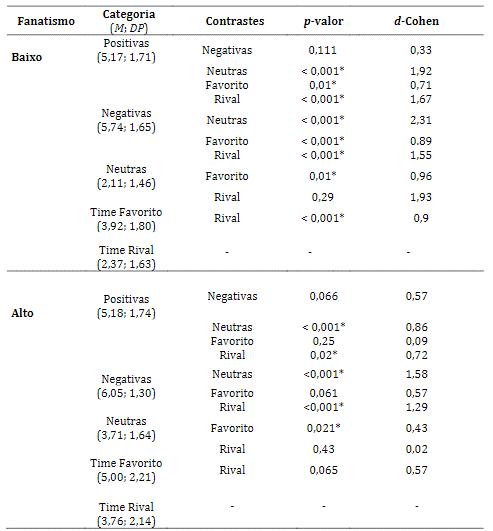 Contudo, diferenças importantes também foram identificadas analisando os padrões de resposta dentro dos grupos. De forma mais detalhada, observou-se que, apenas no grupo de alto fanatismo, a excitação emocional desencadeada pelo time favorito se equipara a de figuras positivas e negativas do IAPS, bem como à excitação elicitada por imagens do time rival (Tabela 4).