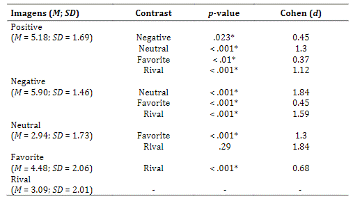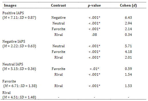 The ANOVA revealed a significant effect for the variable "Images," indicating that the categories (favorite team; rival team; positive, neutral, and negative IAPS images) differed from each other (F₄,₁₀₄ = 4.127; p < .001; η² = 0.746) regardless of the level of fanaticism. Additional planned comparisons indicated significant differences for the valence dimension between all image categories, except between the neutral IAPS images and rival team images (p = .08; d = .34). The values obtained in each comparison are specified in Table 1.