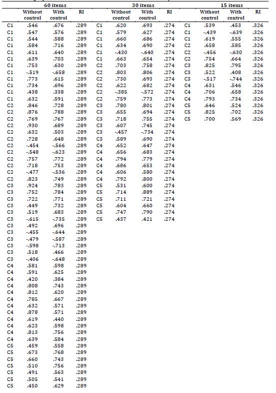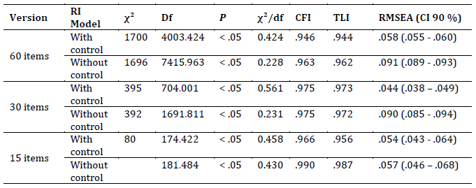 Regarding the factor loadings for the model without control and with acquiescence control, the values are shown in Table 4. According to the results, the items demonstrated a significant contribution to their respective value in both models (without control and with control) and for all versions (60, 30 and 15 items). However, it is worth noting that most items showed improvement when controlled, especially items with negative content.