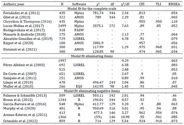 Among studies conducted in Spanish-speaking contexts, Grimaldo et al. (2022) examined structural validity, invariance, and reliability among university students in Peru. The results from confirmatory factor analysis (CFA) challenged the original four-dimensional model. However, a suitable model fit was attained by eliminating the reversed items and those with negligible variance. In different research, the four items with reverse wording and negation (4, 14, 18, and 15) were excluded, resulting in a satisfactory fit for the four-dimensional model (Palmese & Schmidt, 2013). In another study involving university students from Colombia, CFA revealed poor indicators for nine items. Subsequently, they attempted to enhance model fit by removing the reversed items, which led to favorable fit indicators (Arenas-Estevez et al., 2021).