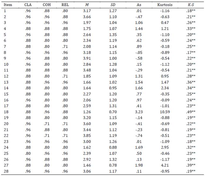 Table 2 reports CVC and descriptive statistics with a normality test. Results of the agreement procedure among judges showed very good values in the criterion validity coefficients. All items exceeded the acceptable threshold (CVI > .70), and only four out of the 28 items had CVC values below .80; while the remaining 86 % exhibited excellent CVC indices > .80. Normality test, using the Kolmogorov-Smirnov statistic, rejected the normality hypothesis, indicating that IRI items do not conform to a normal distribution.