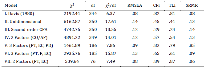 Regarding the confirmatory factor analysis (CFA), the weighted least squares mean and variance adjusted (WLSMV) estimator was used, as it is recommended for ordered categorical data due to its robustness and the fact that it does not assume a normal distribution of variables (Flora & Curran, 2004; Freiberg et al., 2013; Li, 2016). Several factorial structures were tested, including the original four-factor solution proposed by Davis (1980), a second-order factorial structure, a two-factor model distinguishing between the cognitive (CO) and affective (AF) dimensions, a three-factor model comprising PT, EC, and PD, a three-dimensional structure including PT, F, and EC, and finally, a two-dimensional model including PT and EC. Finally, the same factorial structures were tested after removing the negative items.