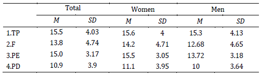 In the Spanish adaptation used in the present study (Pérez Albéniz et al., 2003), adequate reliability values were obtained using Cronbach's Alpha as the parameter. In a sample of 515 students, for males, values of .73 were obtained for PT, .76 for F, .68 for EC (including item 13), and .70 for PD. For females, values of .75 were obtained for PT and F, .70 for EC (including item 13), and .72 for PD.