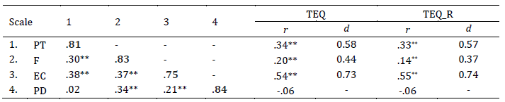 Table 7: Convergent validity study with Toronto Empathy Questionnaire (TEQ), reliability and intercorrelation of the subscales