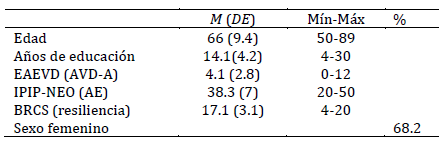En la Tabla 1 se observan los descriptivos demográficos de la muestra. Se informan además los puntajes de los tres instrumentos empleados: EAEVD para explorar la realización de AVD-A, Inventario de Personalidad IPIP-NEO para evaluar la AE y BRCS para la medición de resiliencia.