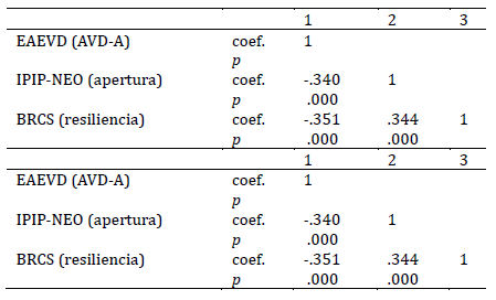 Tabla 2: Correlaciones entre AVD-A, apertura y resiliencia