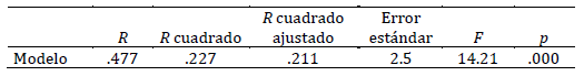 El modelo de regresión más robusto evidenció que el puntaje de resiliencia, el puntaje de AE y los años de educación explican el 21 % de la varianza del score de AVD-A (Tabla 3). El modelo es estadísticamente significativo y de efecto mediano. Se obtuvieron coeficientes β estandarizados de -.268 (puntaje de resiliencia), -.264 (años de educación) y -.234 (puntaje de AE).