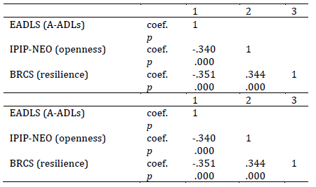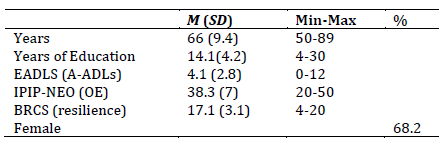 Table 1 shows the demographic descriptives of the sample. The scores of the three instruments used are also reported: EADLS to explore the performance of A-ADLs, IPIP-NEO Personality Inventory to assess OE and BRCS to measure resilience.