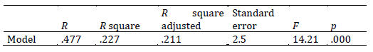 The most robust regression model showed that resilience score, OE score and years of education explain 21% of the variance of the A-ADLs score (Table 3). The model is statistically significant and of medium effect. Standardized β coefficients of -.268 (resilience score), -.264 (years of education) and -.234 (OE score) were obtained.