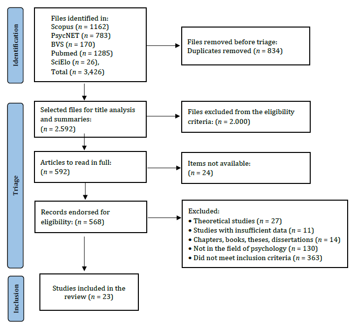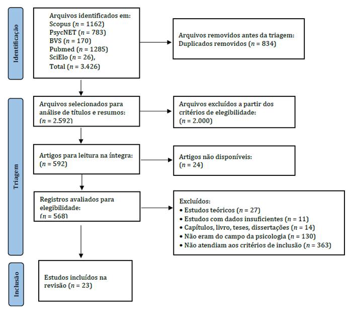 Na busca inicial das bases de dados científicas, foram recuperados 3426 artigos, sendo: Scopus (n = 1162), PsycNET (n = 783), BVS (n = 170), Pubmed (n = 1285), SciElo (n = 26), dos quais 834 foram removidos por serem duplicados. Analisaram-se 2592 publicações pelo título e resumo, sendo eliminados 2000 estudos por não cumprirem os critérios de inclusão. Logo, 592 artigos foram avaliados na íntegra, no entanto, 24 foram excluídos por não estarem disponíveis para leitura. Dos 568 artigos restantes para serem avaliados na íntegra quanto à elegibilidade, foram excluídos 545, sendo: estudos teóricos (n = 27); estudos com dados insuficientes (n = 11); capítulos, livro, teses, dissertações (n = 14); não eram do campo da psicologia (n = 130); não atendiam aos critérios de inclusão (n = 363). Ao final, 23 artigos foram incluídos para a revisão (Figura 1). Ademais, um resumo das características gerais de interesse dos estudos incluídos é fornecido na Tabela 2.