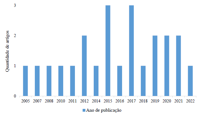 As datas de publicação dos artigos incluídos na revisão ocorreram entre 2005 e 2022. Os anos com maior número de publicações foram 2015 (Donnelly et al., 2015; Harnish & Bridges, 2015; Spinella et al., 2015) e 2017 (Harnish et al., 2017; Islam et al., 2017; Sharif & Khanekharab, 2017), conforme mostrado na Figura 2.