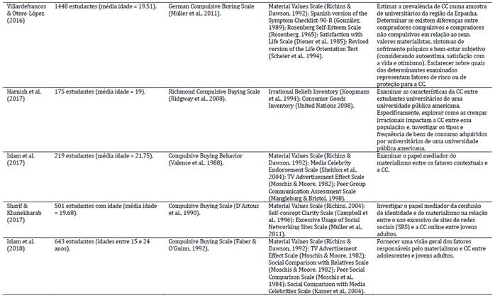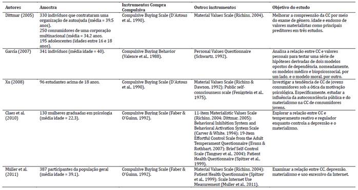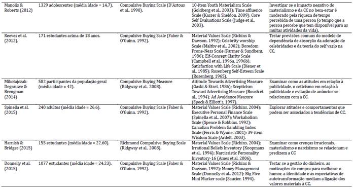 Quanto aos instrumentos utilizados para medir a CC, foi observado o uso de sete medidas diferentes, entretanto as mais aplicadas foram: Compulsive Buying Scale (D’Astous et al., 1990), Compulsive Buying Scale (Faber & O’Guinn, 1992), Richmond Compulsive Buying Scale (Ridgway et al., 2008). No entanto, vale salientar que os diferentes instrumentos elaborados para medir a CC centram-se em aspectos/dimensões diferentes, assim, existem escalas com itens voltados ou para controle de impulso (D’Astous et al., 1990), ou para o obsessivo-compulsivo (Faber & O’Guinn, 1992) ou para ambos (controle de impulso e obsessivo-compulsivo; Ridgway et al., 2008) ou para vícios comportamentais (Andreassen, 2014).
