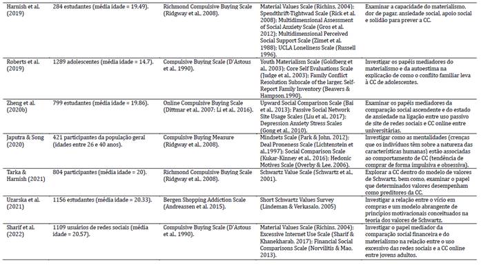 Em relação às variáveis que têm sido estudadas com a CC, é possível dividi-las em duas categorias: a) variáveis de diversas áreas, compostas por construtos relacionados ao marketing, à economia e à psicologia (e.g., gestão do dinheiro, influência da publicidade, autoestima, depressão, ansiedade e bem-estar subjetivo) e b) construtos da PS, composto por variáveis que mensuram algum construto da PS relacionada à CC (e.g., valores materialistas, crenças, atitudes, comparação social). Dentro do enquadramento da PS é possível observar que a temática mais abordada nos estudos é sobre os valores materialistas (e.g., Manolis & Roberts, 2012; Müller et al., 2011; Uzarska et al., 2021).