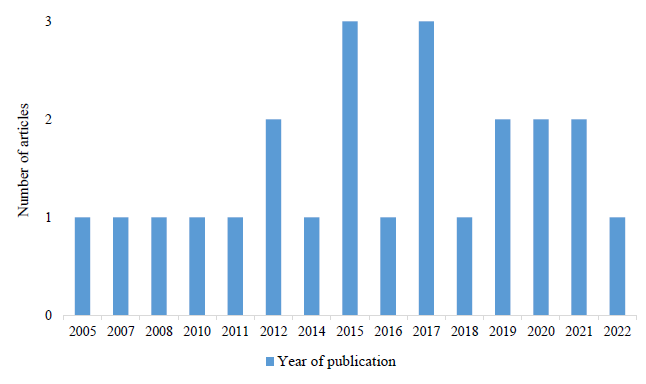 The publication dates of the articles included in the review were between 2005 and 2022. The years with the highest number of publications were 2015 (Donnelly et al., 2015; Harnish & Bridges, 2015; Spinella et al., 2015) and 2017 (Harnish et al., 2017; Islam et al., 2017; Sharif & Khanekharab, 2017), as shown in Figure 2.