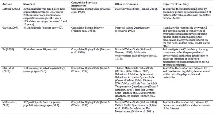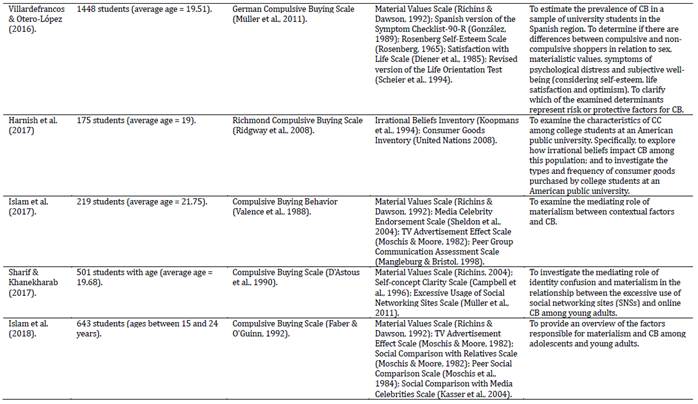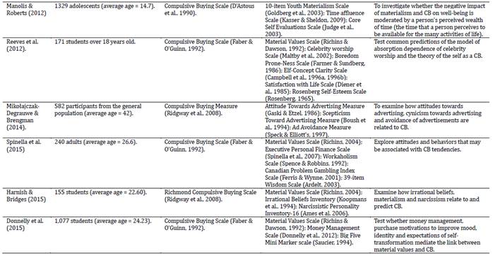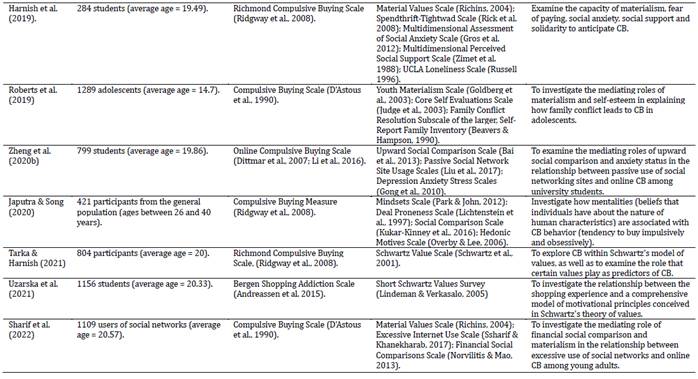 Regarding the instruments used to measure CB, the use of seven different measures was observed, among which the most applied were: Compulsive Buying Scale (D'Astous et al., 1990), Compulsive Buying Scale (Faber & O'Guinn, 1992), Richmond Compulsive Buying Scale (Ridgway et al., 2008). However, it is worth noting that the different instruments developed to measure CB focus on different aspects/dimensions, thus, there are scales with \ items focusing on impulse control (D'Astous et al., 1990), or obsessive-compulsive (Faber & O'Guinn, 1992) or for both (impulse control and obsessive-compulsive; Ridgway et al., 2008) or for behavioral behaviors (Andreassen, 2014).