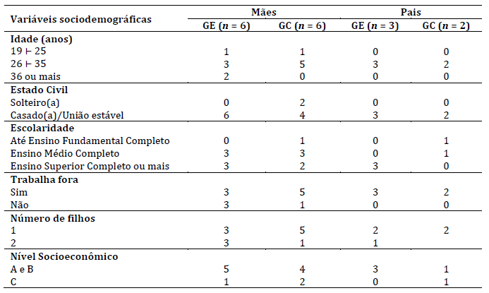 As características sociodemográficas dos participantes estão apresentadas na Tabela 1. De modo geral, mães e pais dos grupos experimental e controle apresentaram perfis semelhantes quanto à faixa etária, estado civil, atividade remunerada e número de filhos. Observou-se maior variabilidade entre os grupos no que se refere à escolaridade e ao nível socioeconômico, especialmente entre os pais.