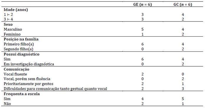 Quanto às características sociodemográficas das crianças que compuseram a amostra, conforme observado na Tabela 2, seis fizeram parte do GE e seis do GC. De forma geral, os grupos apresentaram distribuição semelhante quanto à idade e a frequência escolar. A maioria das crianças era do sexo masculino e ocupava a posição de primeiro filho na família. No grupo experimental, todas tinham o diagnóstico de TEA, enquanto no grupo controle parte ainda estava em investigação diagnóstica. Observou-se uma diversidade nos modos de comunicação, com maior predominância de dificuldades tanto vocais quanto gestuais no grupo controle.