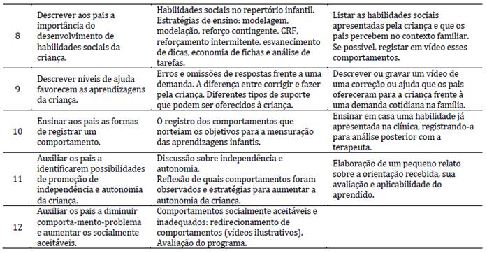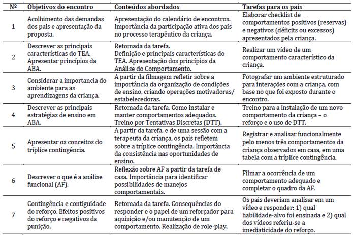 Em cada encontro os conteúdos foram descritos e abordados de forma explicativa e dialogada com os pais, incluindo observações programadas nas sessões da criança e pequenas tarefas de casa (relatos, registros ou vídeos sobre assuntos pertinentes à temática trabalhada no encontro e relacionada aos itens do PEI da criança). Também foram resolvidas dúvidas acerca dos desafios vividos durante a semana com a criança e das tarefas solicitadas no encontro anterior (Ferreira, 2023).