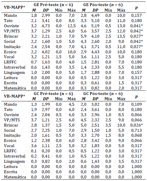 Notas: M: média; DP: desvio padrão; GE: grupo experimental; GC: grupo controle; VB-MAPP: Verbal Behavior Milestones Assesment and Placement Program; VB-MAPP*: Foram apresentadas apenas as categorias que foram pontuadas em marcos do desenvolvimento no instrumento; Nível de significância: p < 0,05; Teste Wilcoxon.