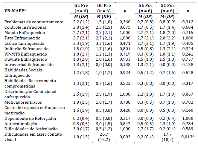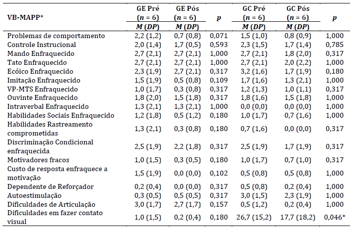 Notas: M: média; DP: desvio padrão; GE: grupo experimental; GC: grupo controle; Pré:pré-teste; Pós: pós-teste; VB-MAPP: Verbal Behavior Milestones Assesment and Placement Program; VB-MAPP*: Foram apresentadas apenas as categorias que foram pontuadas em barreiras de aprendizagem do desenvolvimento no instrumento; Nível de significância: p < 0,05; Teste Wilcoxon.