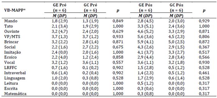 Notas: M: média; DP: desvio padrão; GE: grupo experimental; GC: grupo controle; Pré: pré-teste; Pós: pós-teste; VB-MAPP: Verbal Behavior Milestones Assesment and Placement Program; VB-MAPP*: Foram apresentadas apenas as categorias que foram pontuadas em marcos do desenvolvimento no instrumento; Nível de significância: p < 0,05; Teste Mann-Whitney.