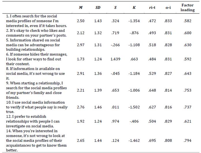 Note: M: Mean; SD: Standard Deviation; S: Asymmetry; K: kurtosis; ri-t: item-total correlation; α-i: alpha is item is deleted.